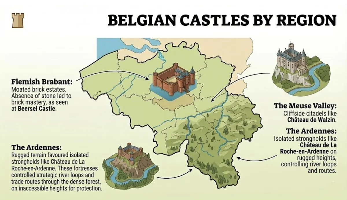 The Ardennes: Rugged terrain favored isolated strongholds like Château de La Roche-en-Ardenne. These fortresses controlled strategic river loops and trade routes through the dense forest.
